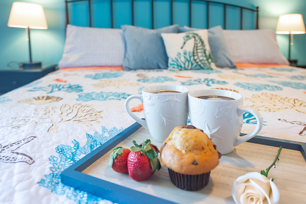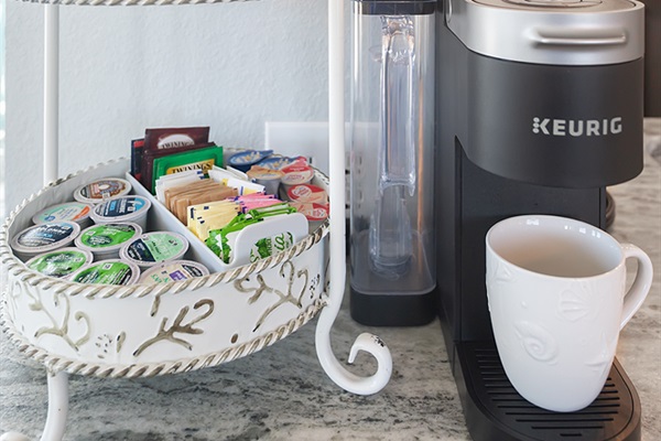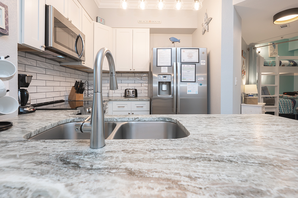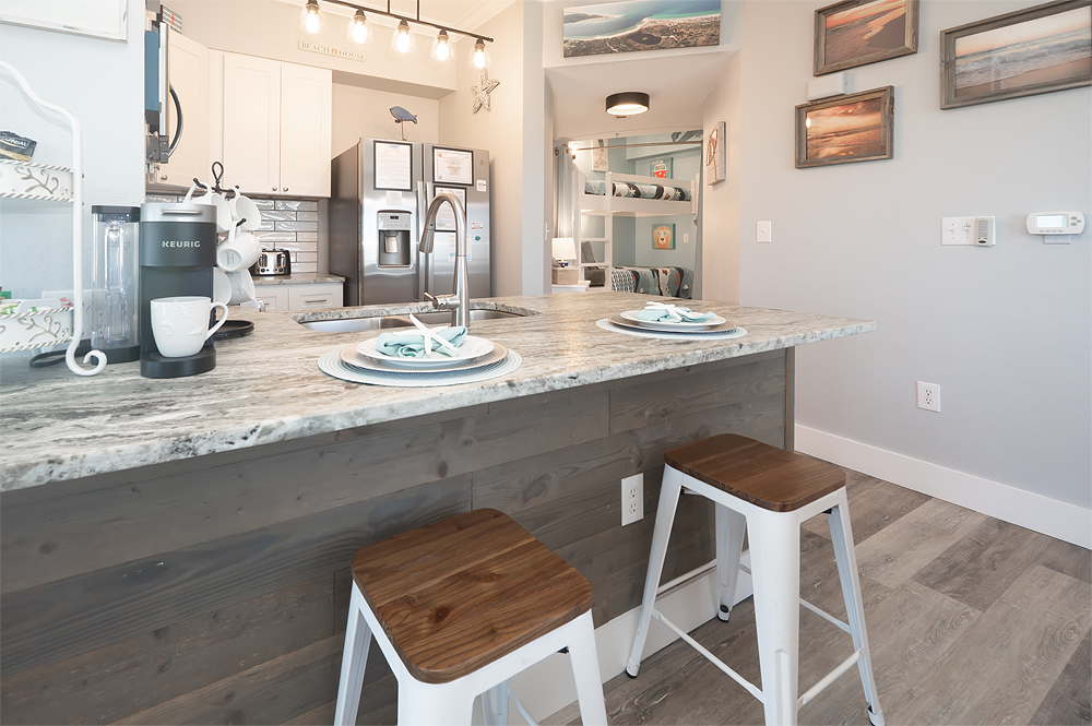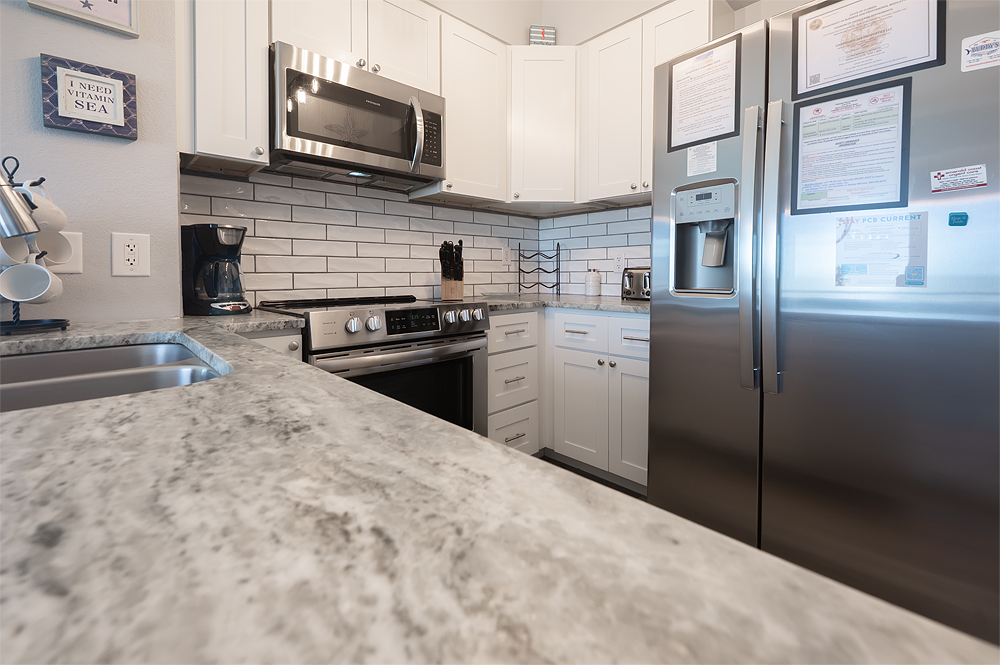 The beautiful glass table in front of the window allows dining with an amazing view. The kitchen is brand new and ready to whip up a dream meal! Your chef will enjoy cooking in the well organized kitchen with stainless steel appliances, decent knives and plenty of cookware, and even a crock pot to allow dinner to cook while you enjoy the beach. Our coffee station has a Keurig coffee pot as well as a conventional one to make morning routines smooth. We start you off with complimentary coffee k-cups, assorted teas, ground coffee & filters, and creamers & sweeteners.