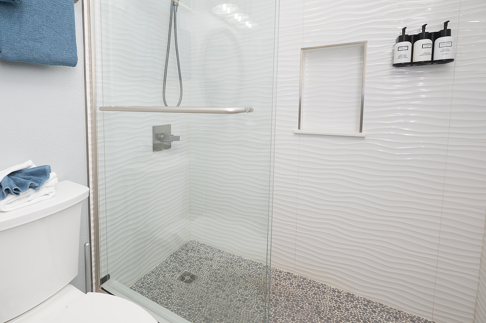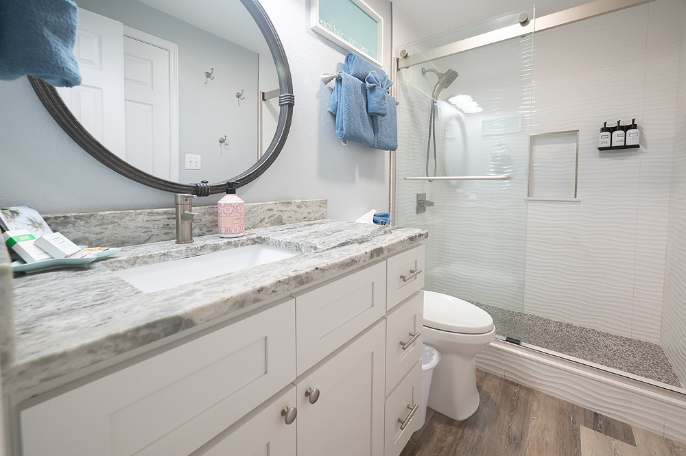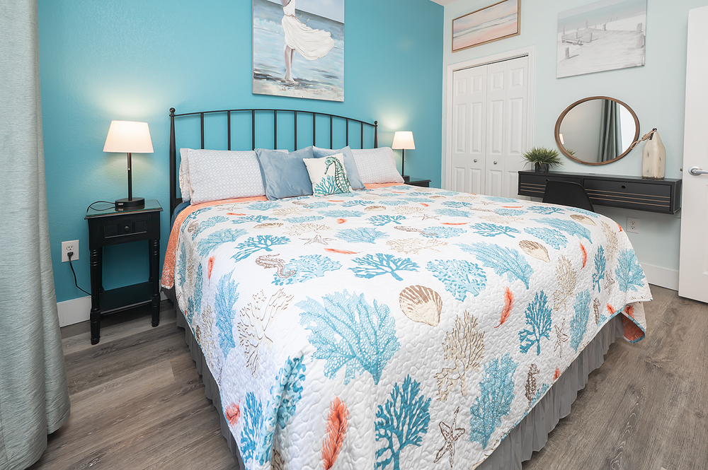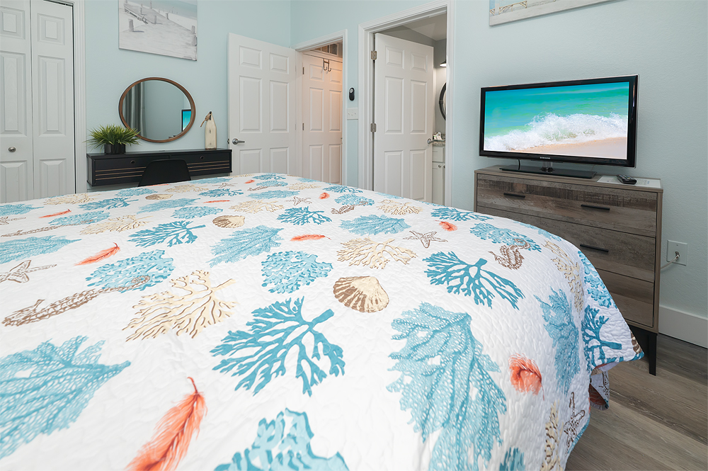 In the front of the unit is a beautifully decorated private bedroom with a king bed and a TV to allow for relaxing. There is plenty of storage in the over-sized closet and dresser. The bedside lights each offer an outlet and a USB port in the lamp base to keep things charged. There is a private door into the bathroom for easy access. There is even a makeup vanity with a mirror to make getting ready for a night out fun! It can double as a work desk if needed. As you leave the master bedroom, on the right is the hall door to the bath and on the left is the door to the laundry closet with a brand new stacked laundry system stocked with laundry supplies for you. There is also a vacuum, mop, and a broom there just in case.