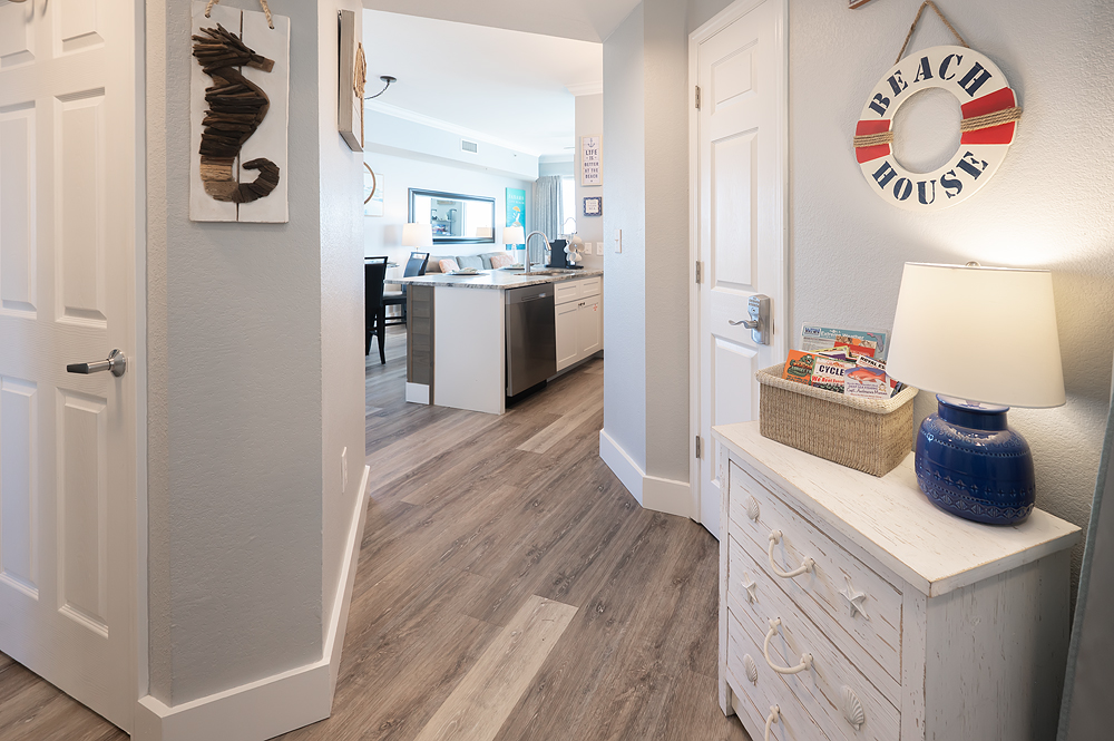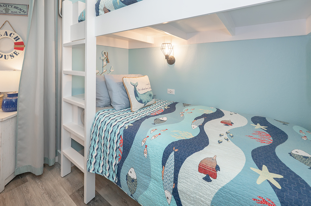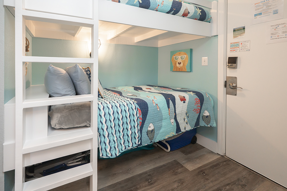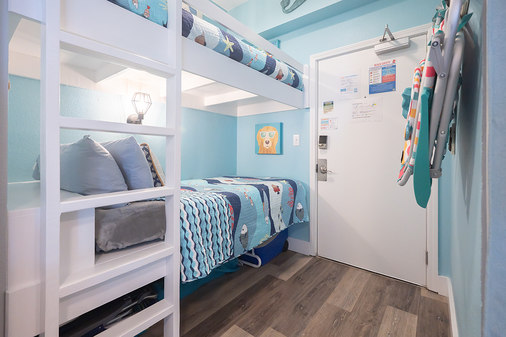 By the unit entrance is a cozy bunk bed nook with a privacy curtain, individual lights and USB outlets by each bed. These are actual size built-in twin beds, so comfy for any age. Underneath them, you will find tons of storage and lots of beach supplies ready to use. You'll find a rolling cooler, an umbrella, and a basket full of sand toys. Hanging behind the unit door, you will find 4 beach chairs ready to go to the beach with you! We even provide beach towels!!!!