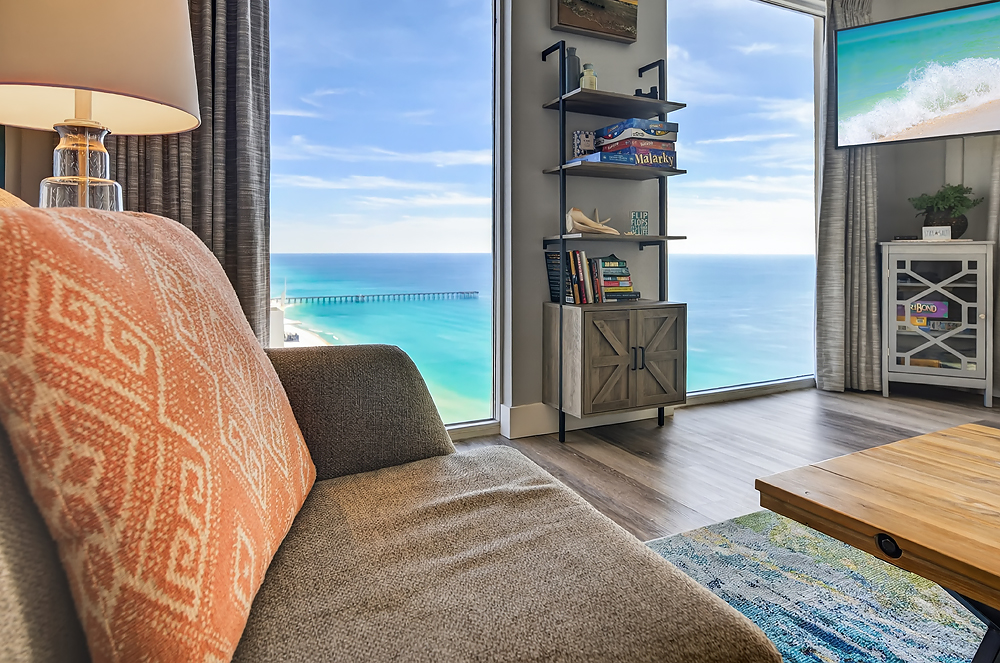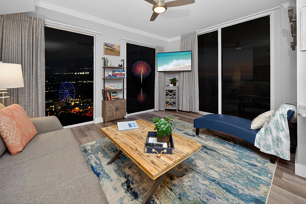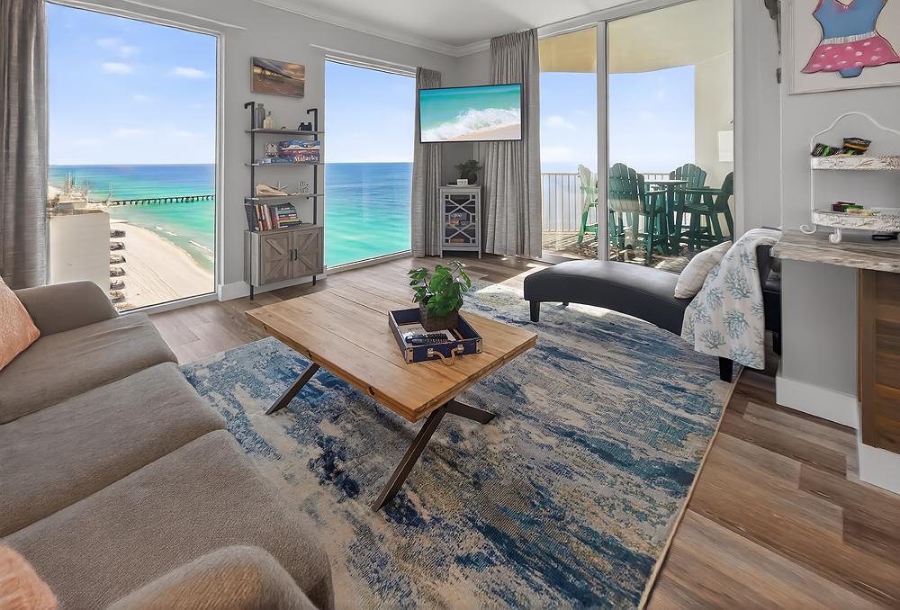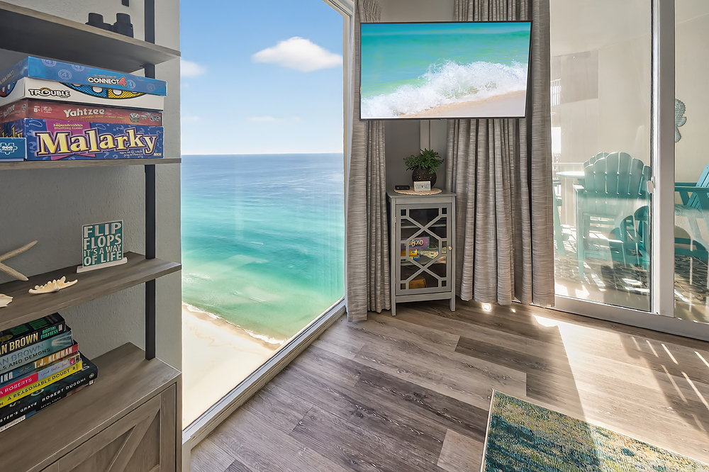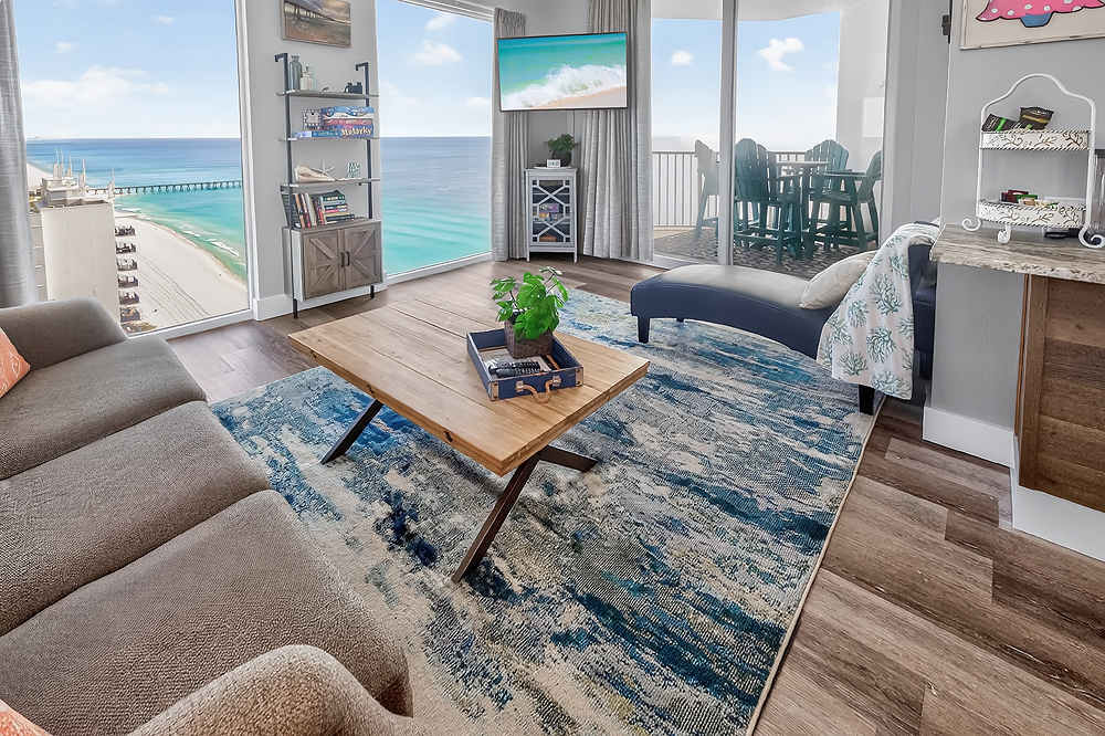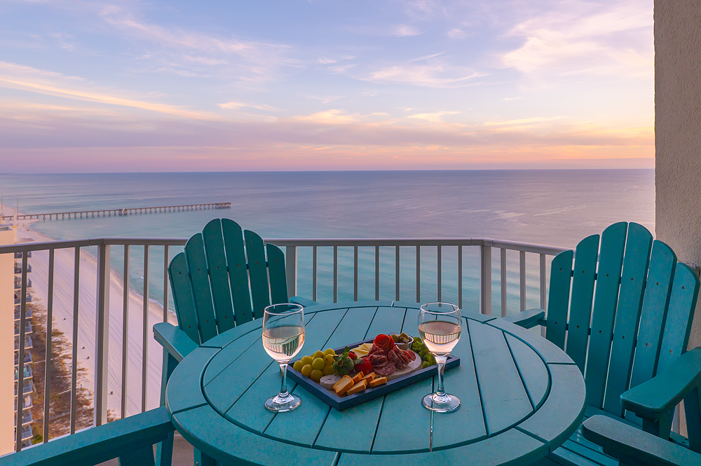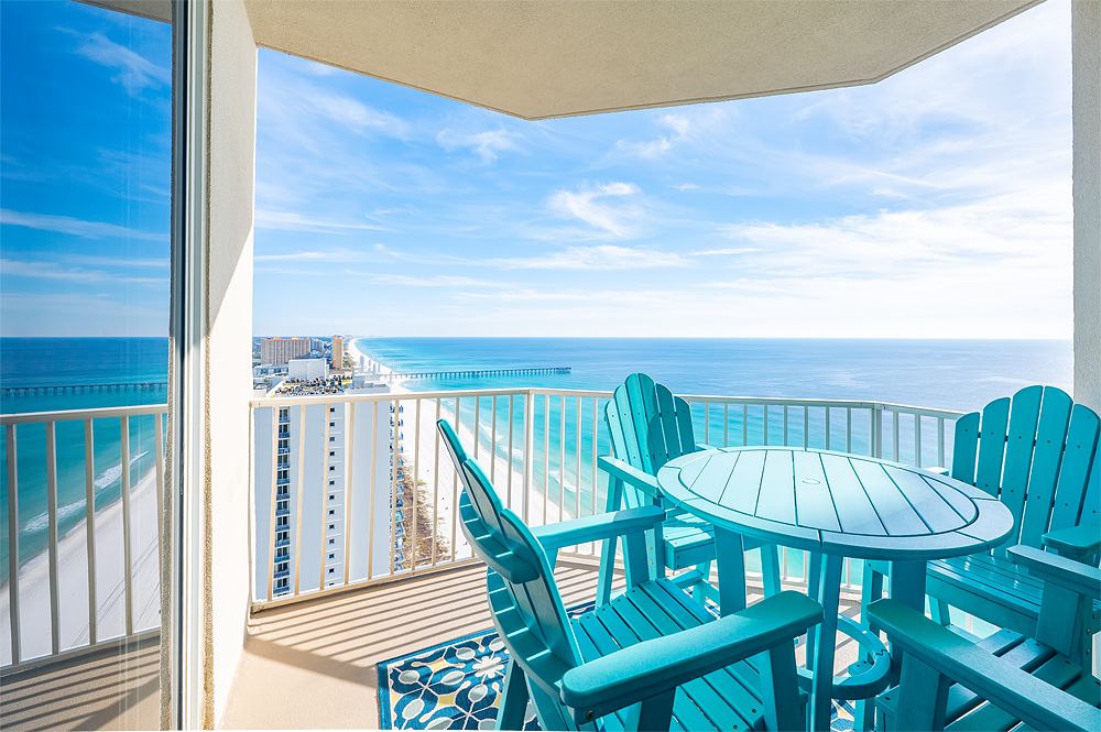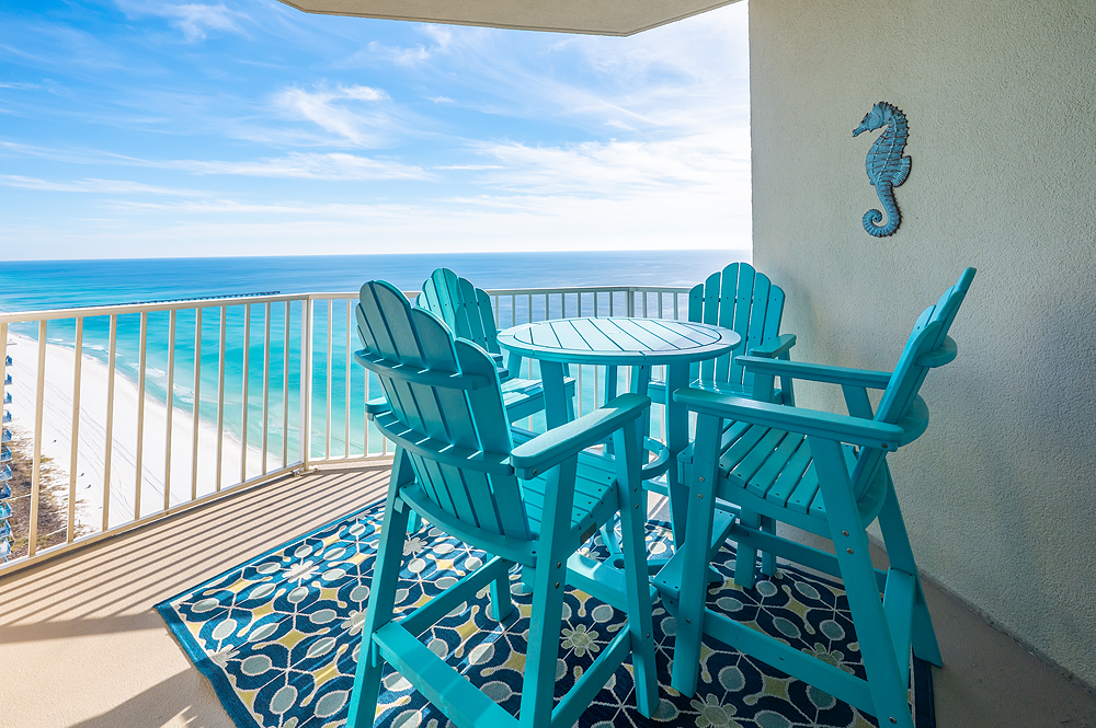 Watch the sunrise right there from your private balcony, sipping your coffee on the outdoor chairs and comfy outdoor rug. A private outdoor living room in the sky! The SkyWheel at Pier Park lights up the night sky, and you have a front row seat to fireworks and festivities there year round without leaving your condo. To the north you can see North Bay, and Lullwater Lake right below.