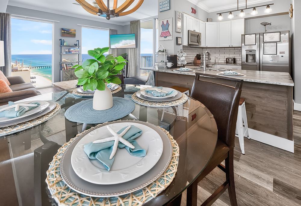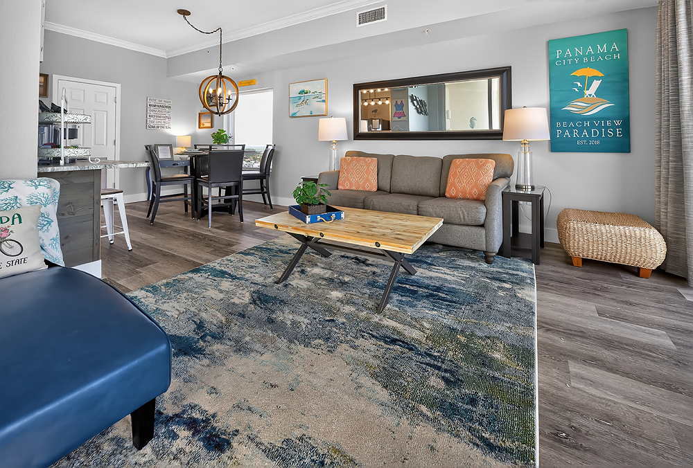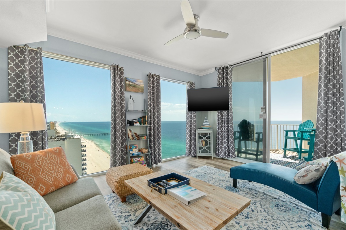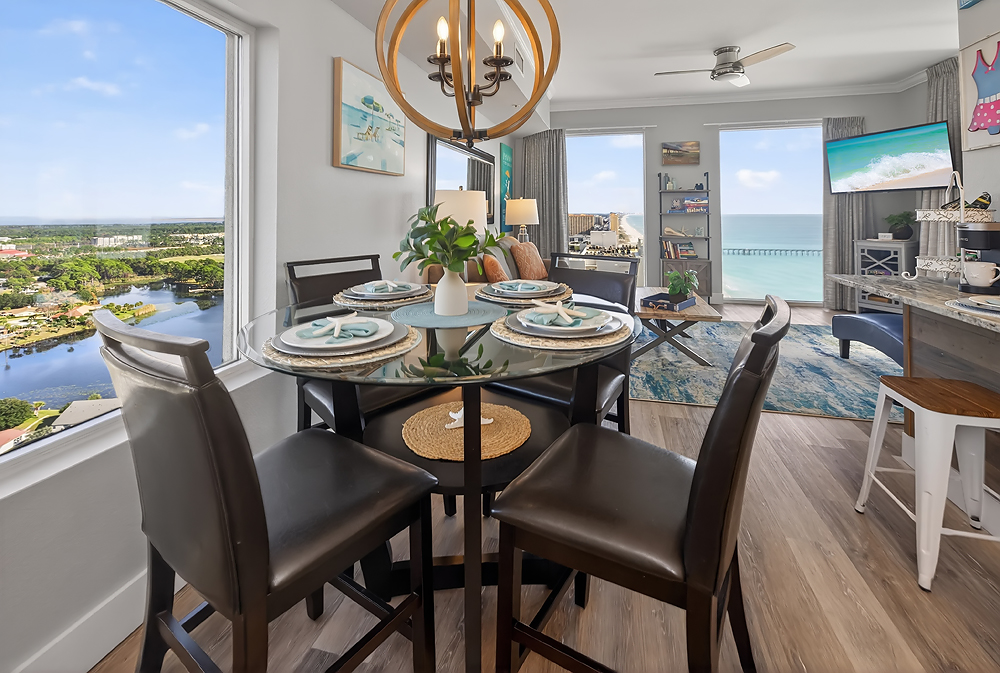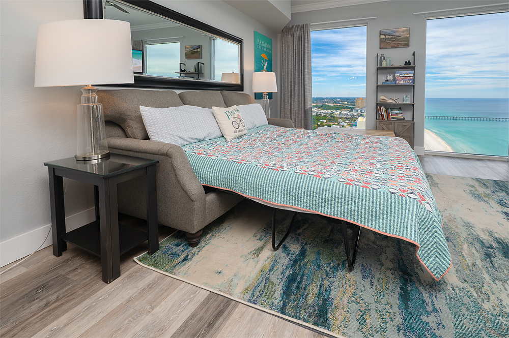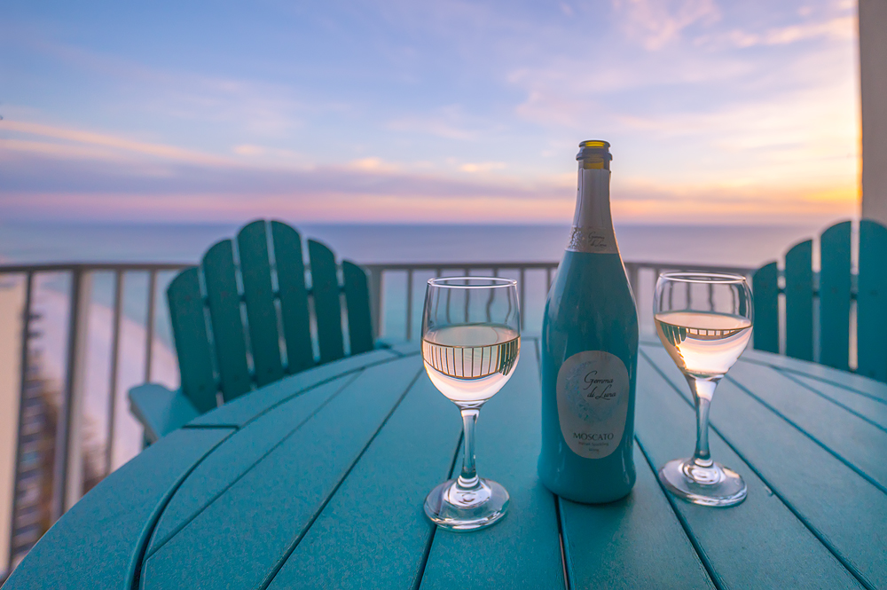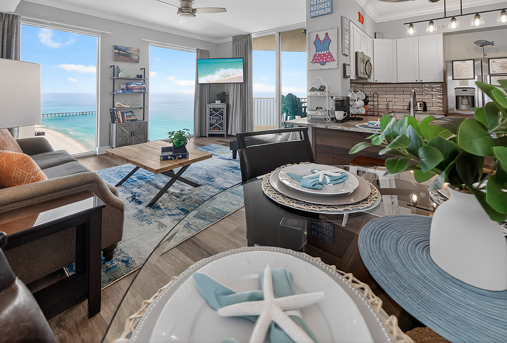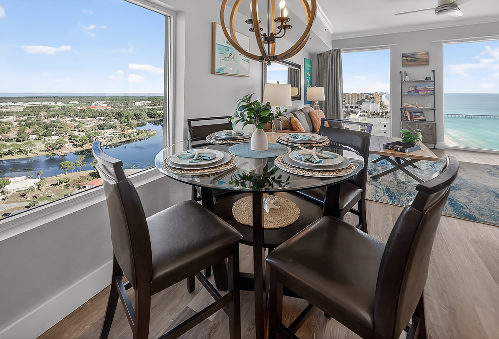 Watch the sunrise right there from your private balcony, sipping your coffee on the outdoor chairs and comfy outdoor rug. A private outdoor living room in the sky! The SkyWheel at Pier Park lights up the night sky, and you have a front row seat to fireworks and festivities there year round without leaving your condo. To the north you can see North Bay, and Lullwater Lake right below.